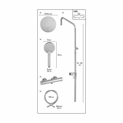 Alle Teile bestehen aus Metall, das Überkopfbrause-Set robust und langlebig macht. Weil du ein Bad willst, das lange hält! Damit du dich angenehm abbrausen oder Haare waschen kannst, besitzt die Handbrause eine Strahlart. Mit ihrem großen Ø von 25,5 cm lädt die Überkopfbrause zu einer erholsamen Regendusche ein. Um Kalkablagerungen vorzubeugen, verfügen Handbrause und Überkopfbrause über Anti-Kalknoppen. Gleichzeitig hast du damit weniger Aufwand beim Reinigen. Damit du alle Körperstellen gut erreichst, ist der Brauseschlauch 150 cm lang – so bietet er dir auch viel Bewegungsfreiheit. Der Brauseschlauch lässt sich mit seinem genormten Anschluss von 18,6 mm (G1/2) schnell und einfach befestigen. Die Duscharmatur ist mit S-Anschlüssen 26,4mm (G3/4) x 21mm (G1/2) versehen. Das Steigrohr kannst du von 75 cm auf 115 ausziehen und bringst es direkt an der Wand an. Damit du direkt mit der Montage beginnen kannst, legen wir dir das Befestigungsmaterial dazu.