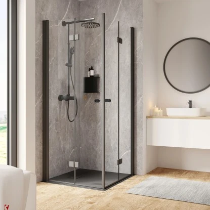 Die Schulte ExpressPlus Drehfalttür Eckeinstieg Garant 2.0 Alu-Natur hat eine Größe von 200 cm x 80 cm x 80 cm und setzt sich aus insgesamt vier 6 mm starken Sicherheitsglas-Elementen (ESG) zusammen. Die beiden Türelemente öffnen über zwei formschöne Griffe über Eck und bieten somit einen großzügigen Einstiegsbereich. Die raumsparende Tür lässt sich einfach zusammenfalten, sodass auch im geöffneten Zustand kein Element in den Raum hineinragt. Dies macht die Drehfalttür zur optimalen Lösung für kleine Bäder. Die eleganten Profile und Anbauteile setzen die Duschtüre zudem optimal in Szene und halten sie sicher in Position.