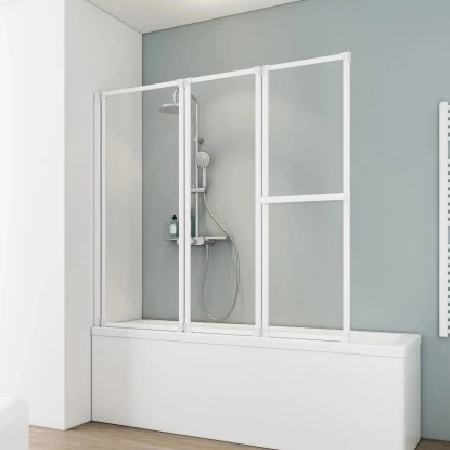 Diese dreiteilige Badewannenfaltwand von Schulte zeichnet sich insbesondere durch ihre dominante Rahmung aus. Außerdem können die einzelnen Elemente für eine optimale Raumnutzung, auch in kleinen Bädern, um 360° gedreht und platzsparend an die Wand gestellt werden.